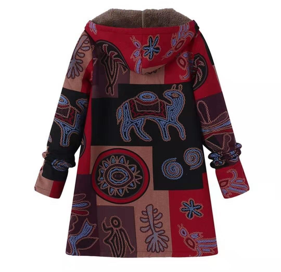 Ethnic Print Hooded Fleece Cotton Coat Jacket